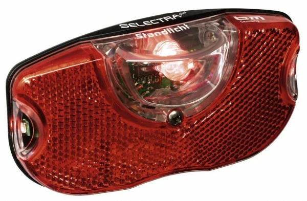 Dieses Rücklicht ist mit einer superhellen großen LED ausgestattet. Zusätzlich sind je 1 kleine LED links und rechts vorhanden, deren seitliche Abstrahlung für erhöhte Sicherheit sorgt. Die eingebaute elektronische Regeleinrichtung sorgt dafür, dass während der Fahrt ein geringer Teil der Energie, die der Dynamo liefert, in einem Kondensator gespeichert wird. Der Kondensator ist bereits nach ca. 3 Minuten bei einer Fahrgeschwindigkeit von etwa 20 km/h voll geladen. Bei langsamer Fahrt und während der Standzeit wird die Energie an die 3 Leds abgegeben. Die Leuchtkraft ist zu Beginn der Standzeit (mindestens 4 Minuten) besonders hoch und vermindert sich im Zeitablauf.Achtung